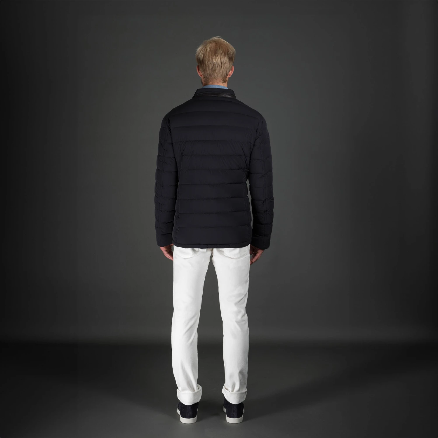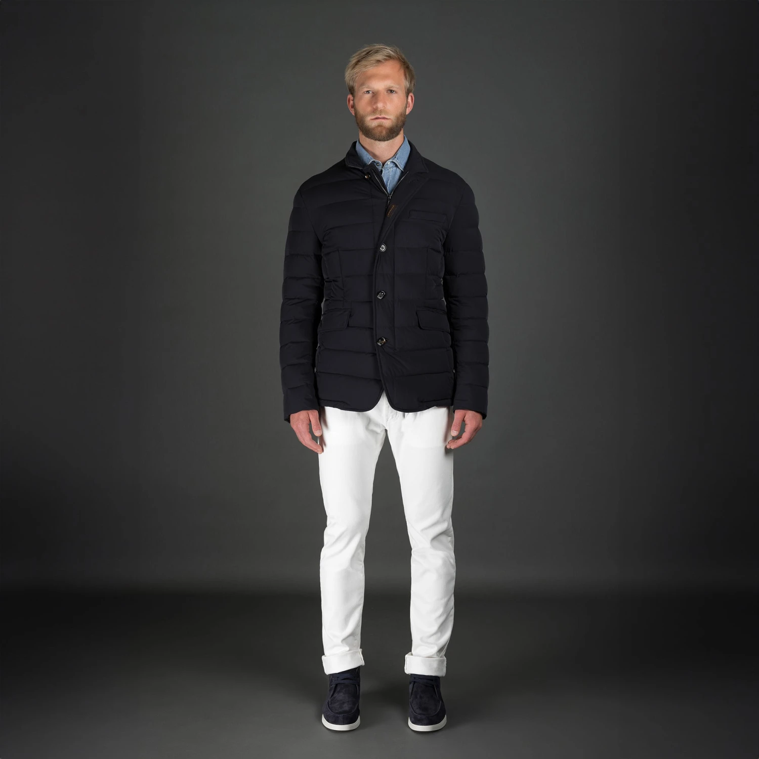 Get ready for the cooler months with this classic quilted jacket from MooRER. Finely crafted in Italy, this wardrobe essential is composed of a technical stretch, water-repellent, and down-proof fabric. This outerwear piece elevates the classic winter jacket with its gold piping on the inside, the wool flannel trim under the collar, finely detailed hardware, and logo engraved horn buttons.
