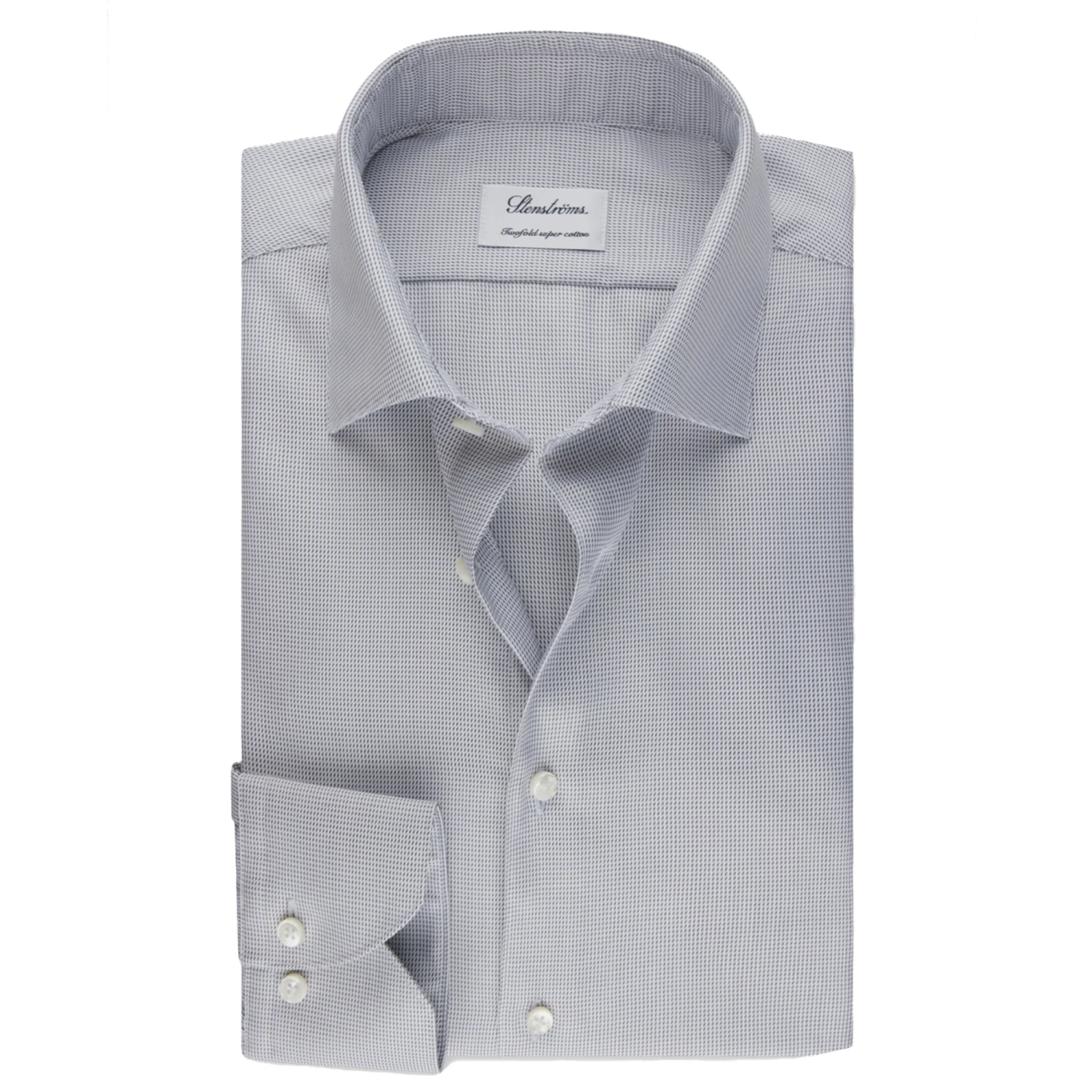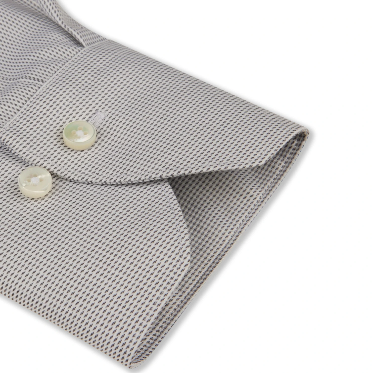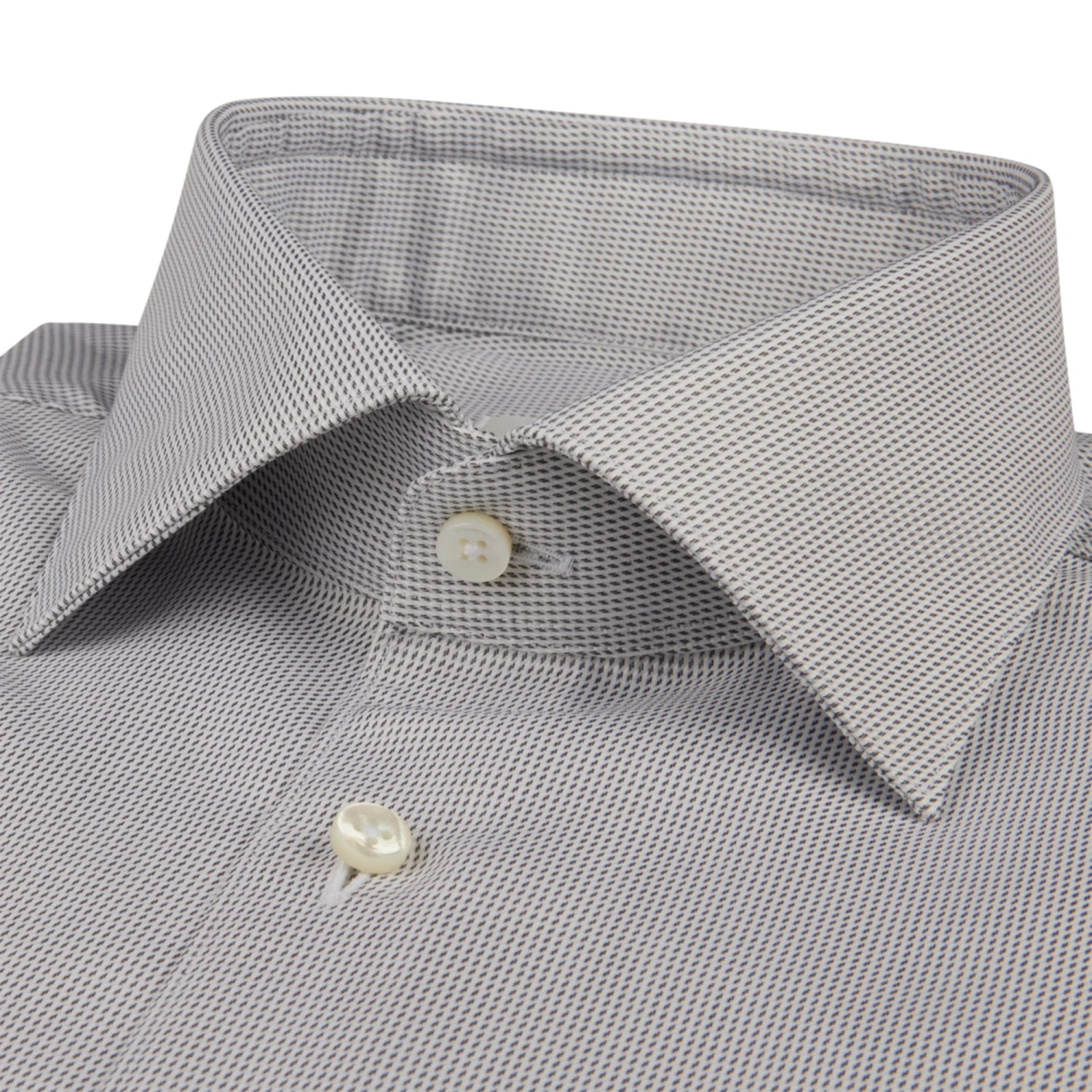 This gray fitted body twill shirt is made of twofold cotton. The shirt is detailed with mother of pearl buttons, single cuffs and a cut-away collar.