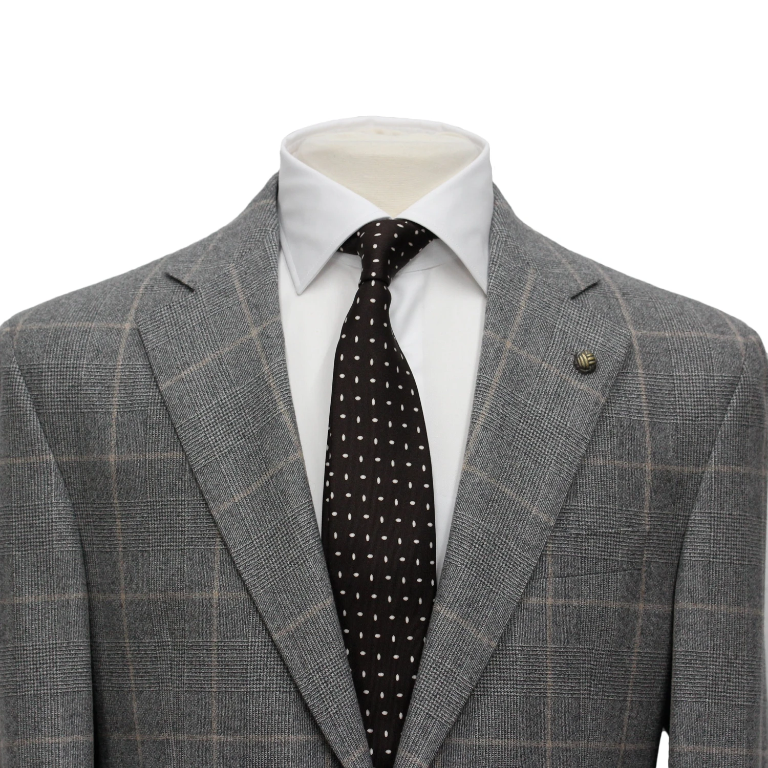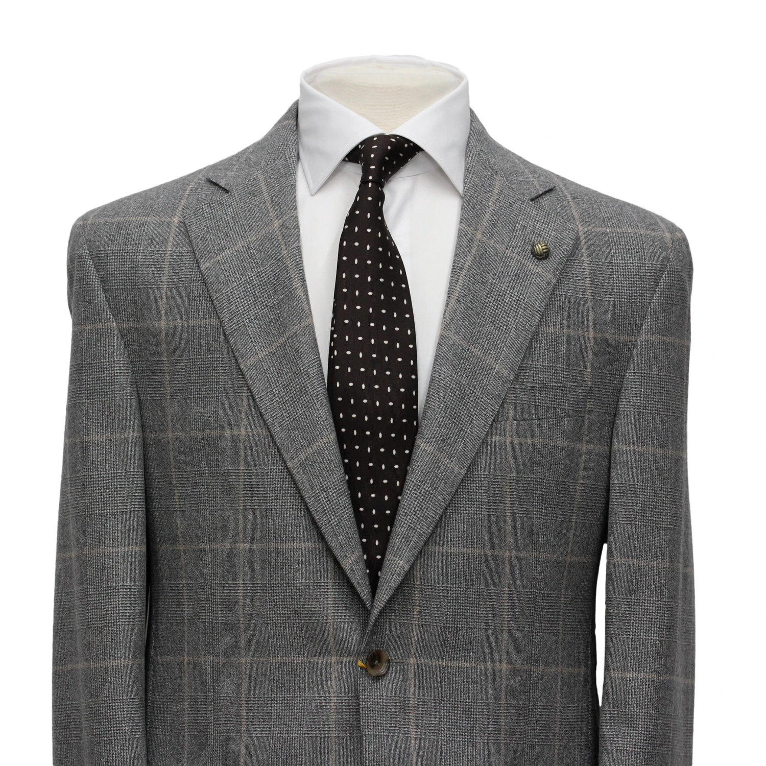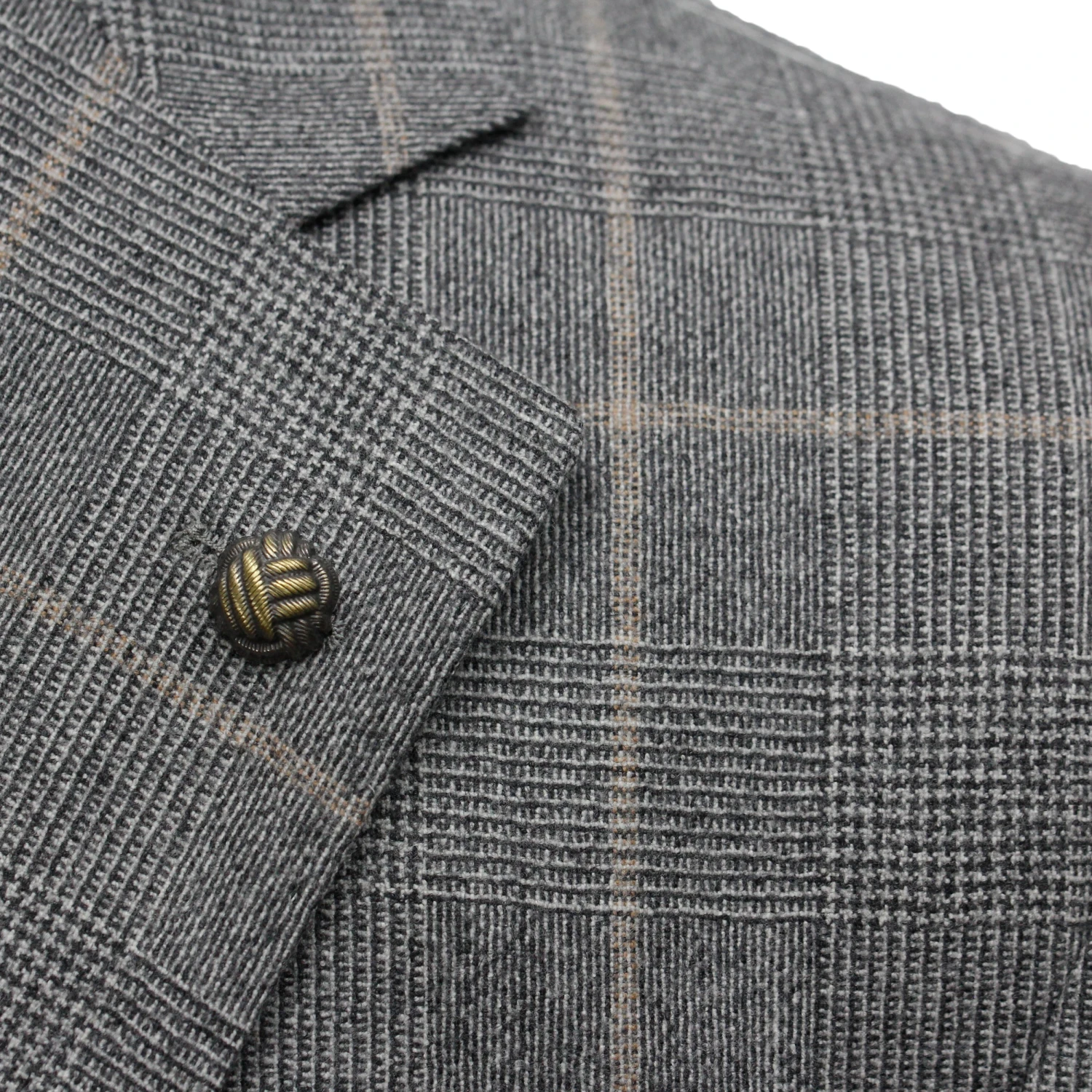 Crafted from 100% Skyfall by Drago wool, this suit from Jack Victor is finer than any of the best cashmere there is. Featuring a grey and light orange check pattern, the suit is a top pick for any office function, delivering a clean and sophisticated appearance. The contemporary fit along with the unconstructed shoulders liberates the wearer, allowing them to have full range mobility.Â