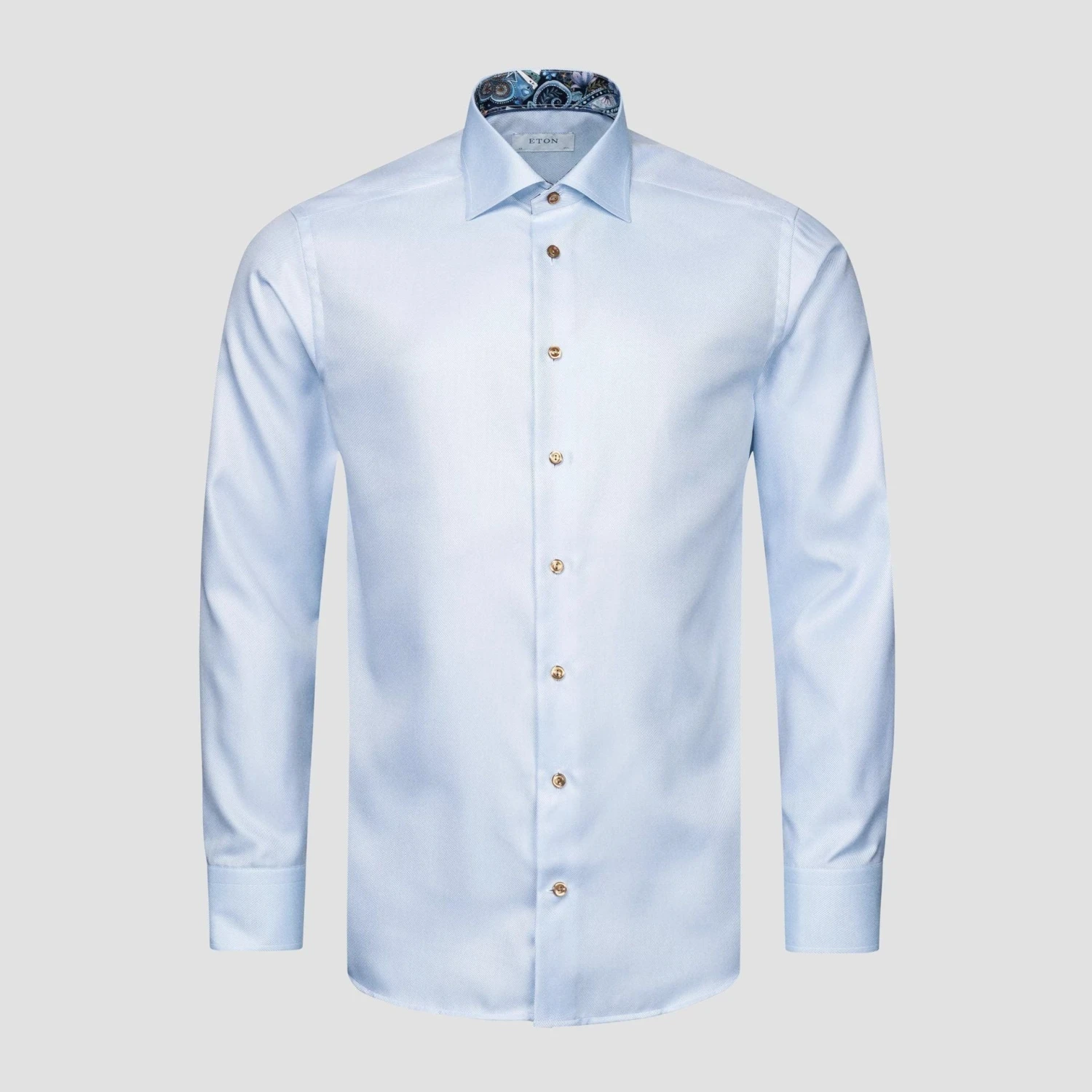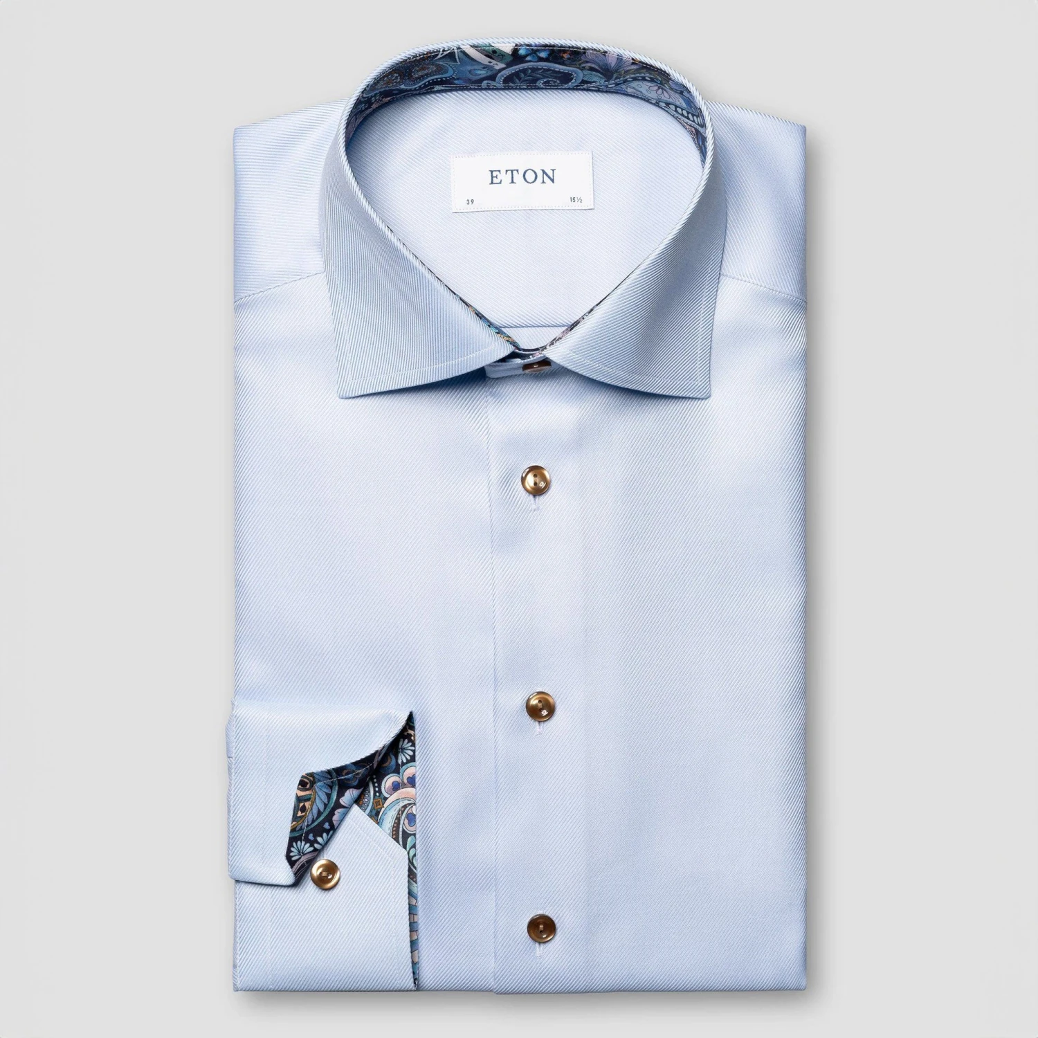This beautiful light blue geometric effect shirt features a rich twill with an elegant, prominent texture. Created by using two ply cotton from extra long staple fibers in both warp and weft. Superior quality, made to last.Â