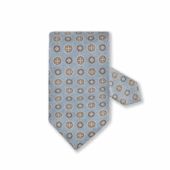 Light blue tie, made of silk. The tie is detailed with a medallion pattern in a brown shade. It’s been made in Italy from a gorgeous silk that drapes nicely. We like pairing this tie with a tailored suit or finely knitted sweater in one of the in the pattern.