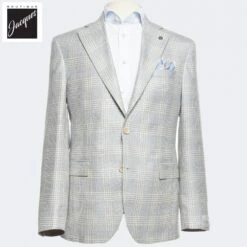 Elevate your summer wardrobe with the Jack Victor Light Gray Check Montana Contemporary Sport Jacket. Featuring a sophisticated light gray glen check with subtle icy blue hues and a light blue soft overcheck, this sport jacket is the perfect combination of refined pattern and relaxed fit. Crafted from a luxurious blend of 65% Wool, 21% Linen, and 14% Silk, the fabric is imported from the renowned REDA Mill in Italy, ensuring both quality and comfort.
