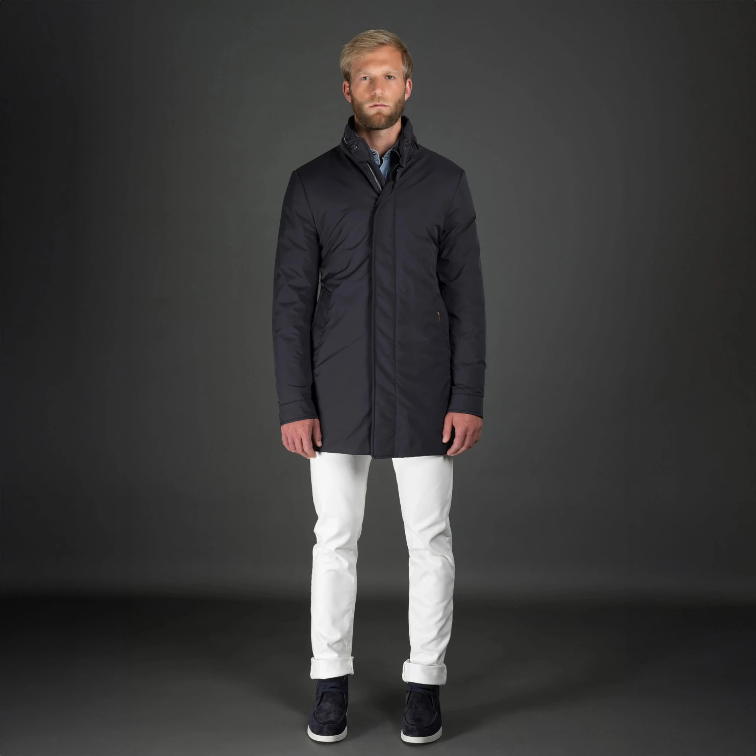 This coat is perfect for winter weather conditions from -7°C to +10°C . Available in a navy blue colour, this trench-coat can be layered over sweaters, dress shirts, tees, and more!