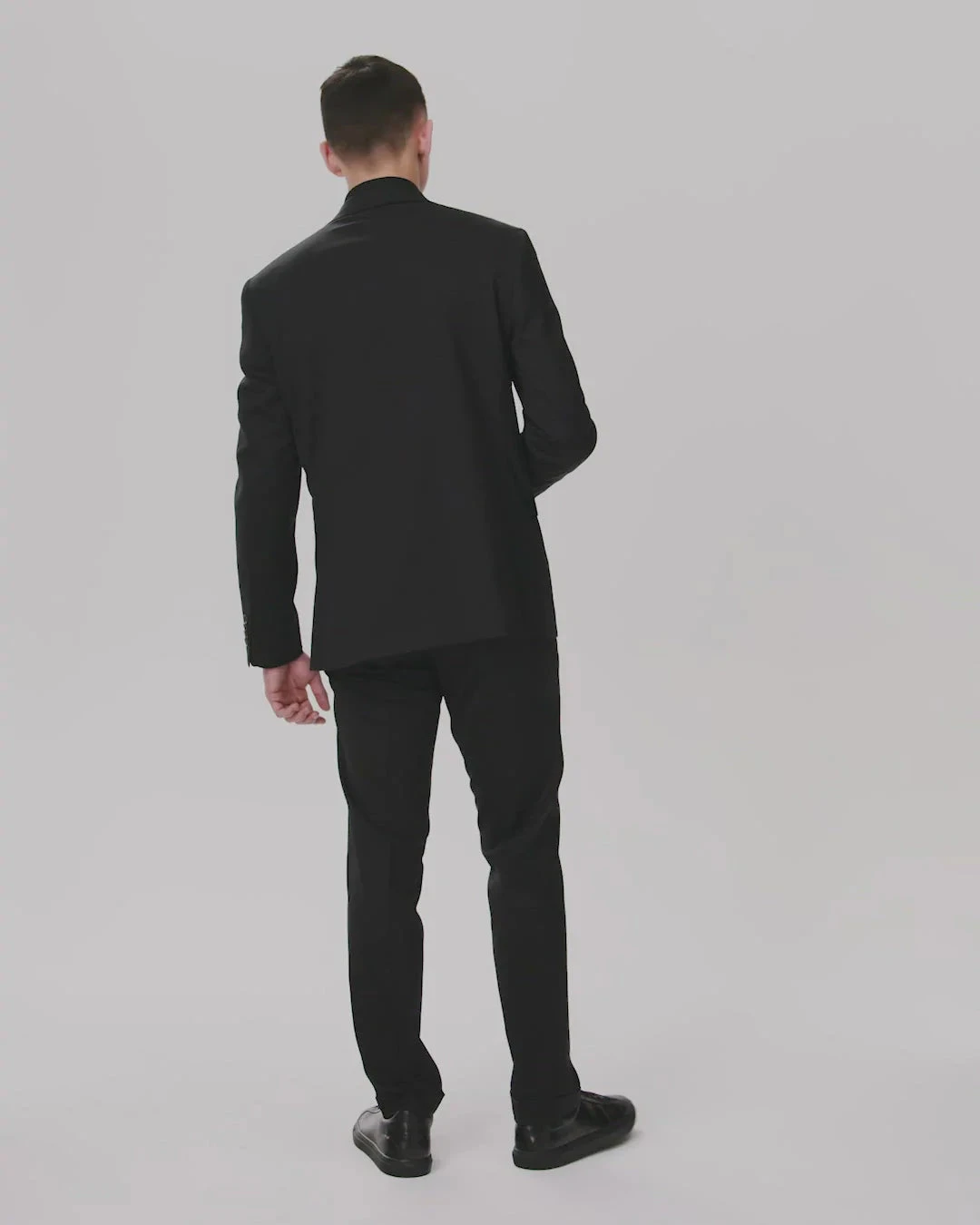 Created for versatile styling all 365 days of the year, the suit is for the perfect fitting suit for any occasion. This black solid suit jacket in natural stretch Super 130’s wool is a versatile addition to any wardrobe with its ability to pair with its matching trousers as a suit or with jeans as a black blazer for a more casual look. Available in our modern fit Esprit model, it features tailored construction in a contemporary fit that is comfortable in the chest and shoulders with a fitted waistline for a clean silhouette.