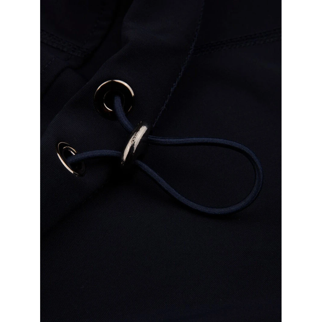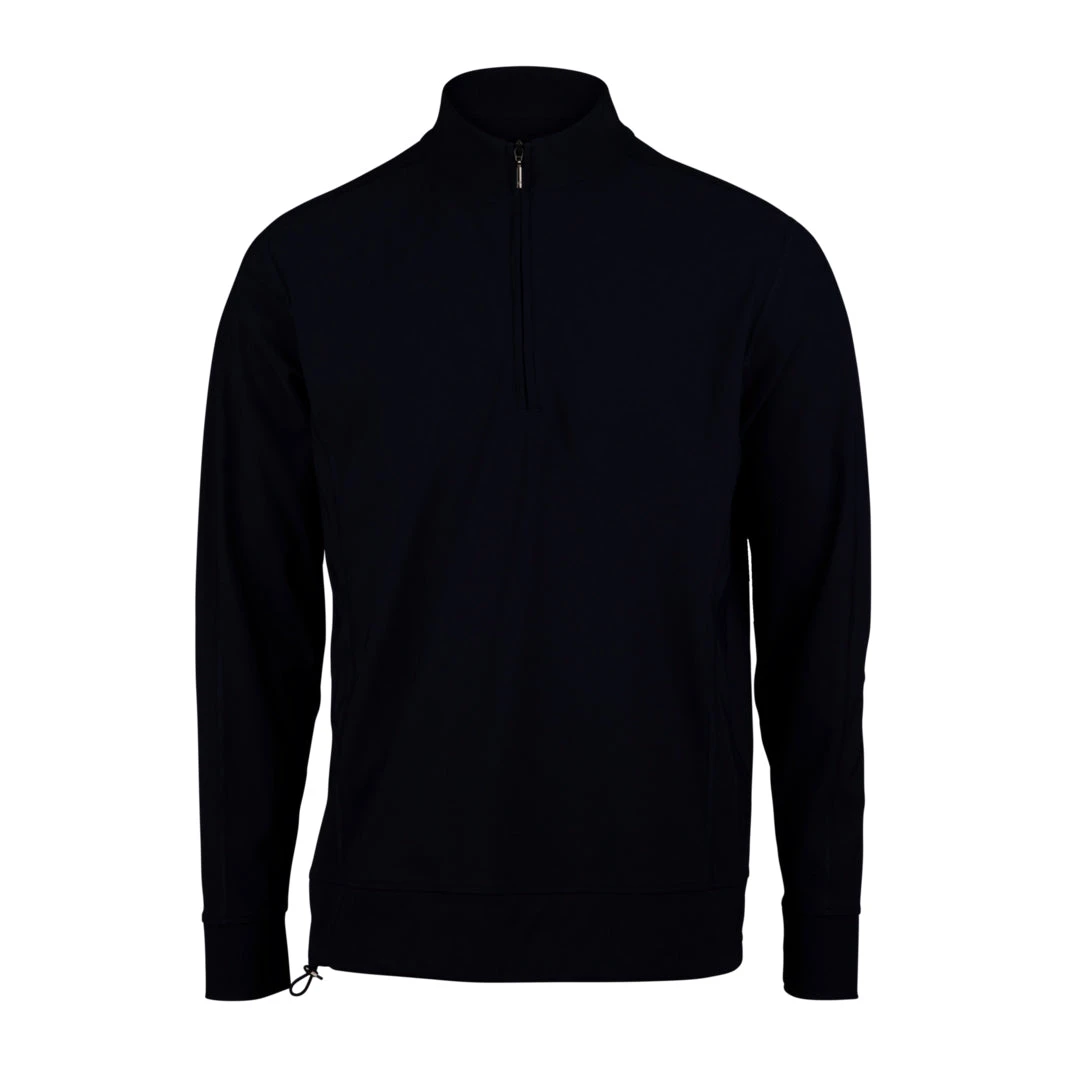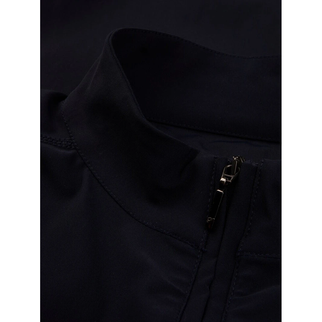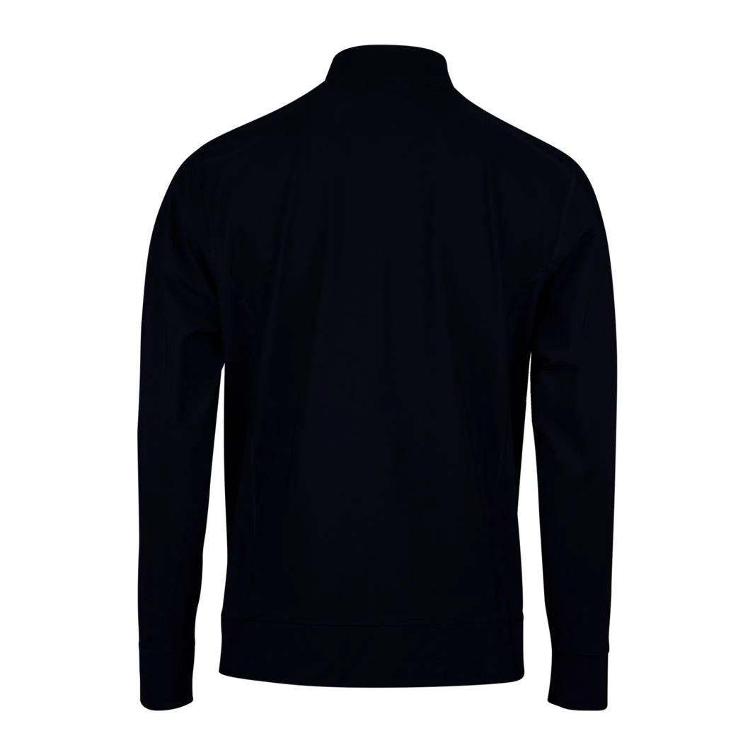 This navy blue half-zip jacket is made of a technical jersey fabric. This casual outerwear piece is detailed with a drawstring and a zipped neck closure. Wear it with a t-shirt and casual bottoms for golfing, working out, running errands or simply lounging around!