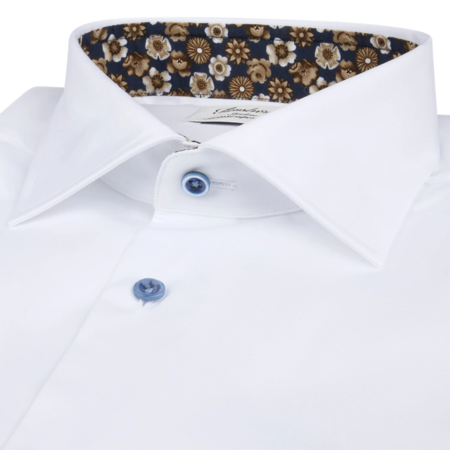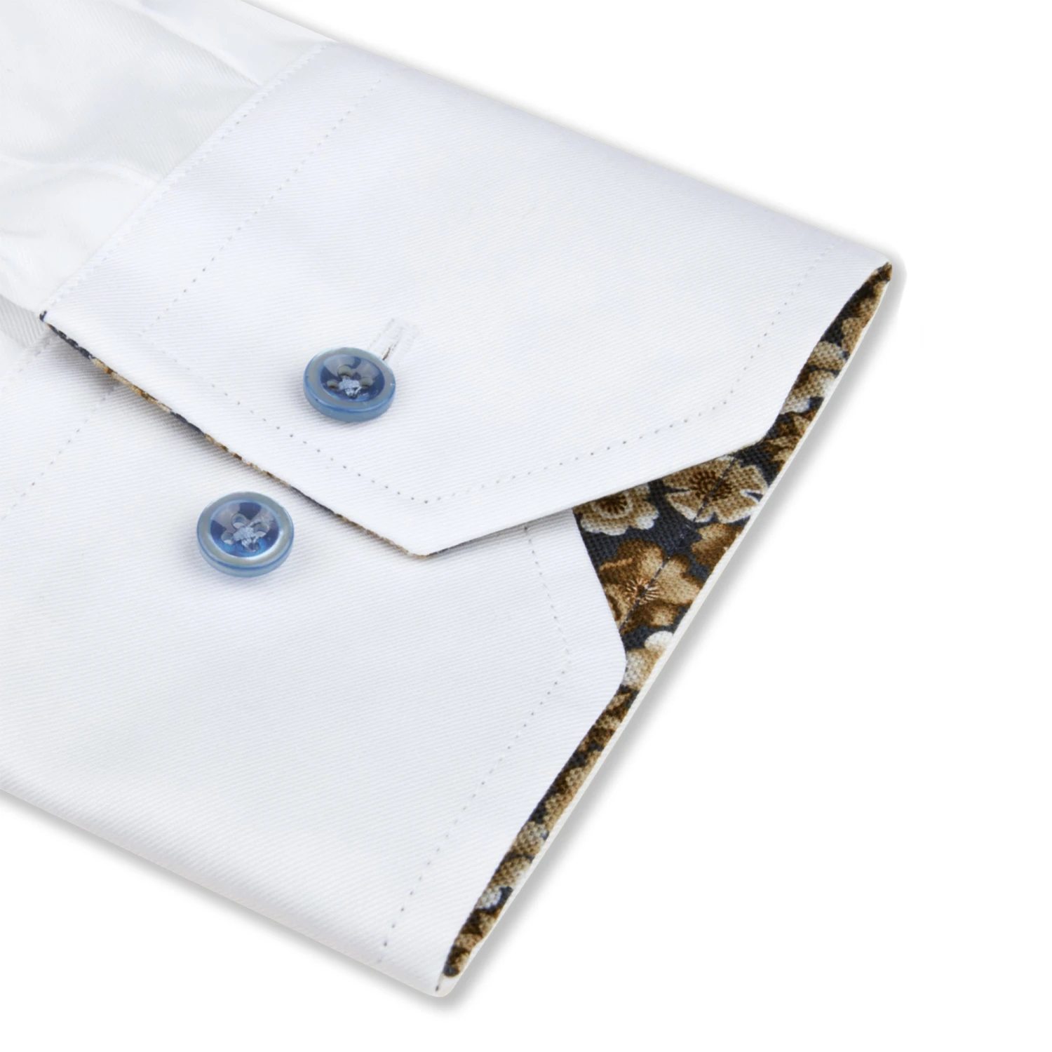 This white twill shirt is made of twofold cotton. The shirt is designed with a floral contrast trim inside the collar and cuffs and is detailed with tonal buttons, single cuffs and a cut-away collar.